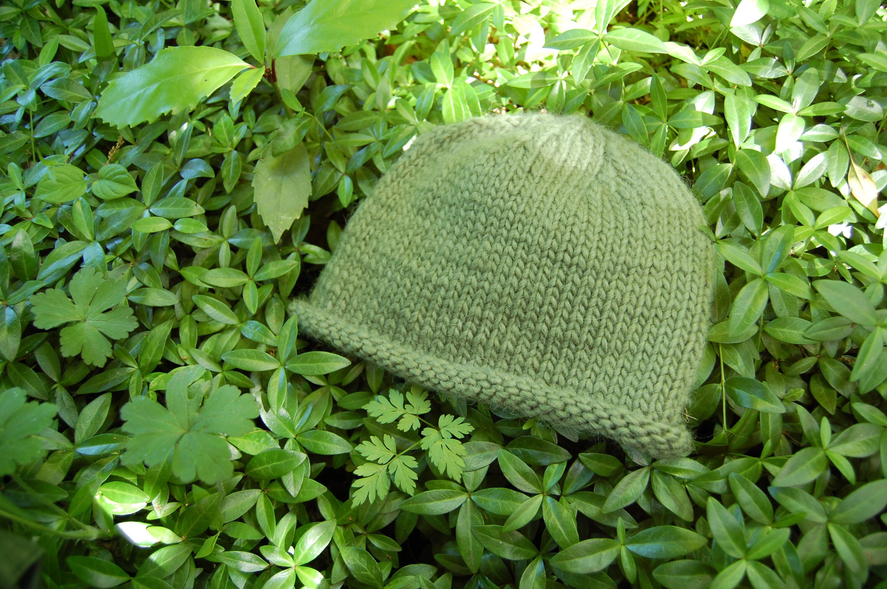 モスグリーンの色が自然を思わせる、毛糸が主役のニット帽。